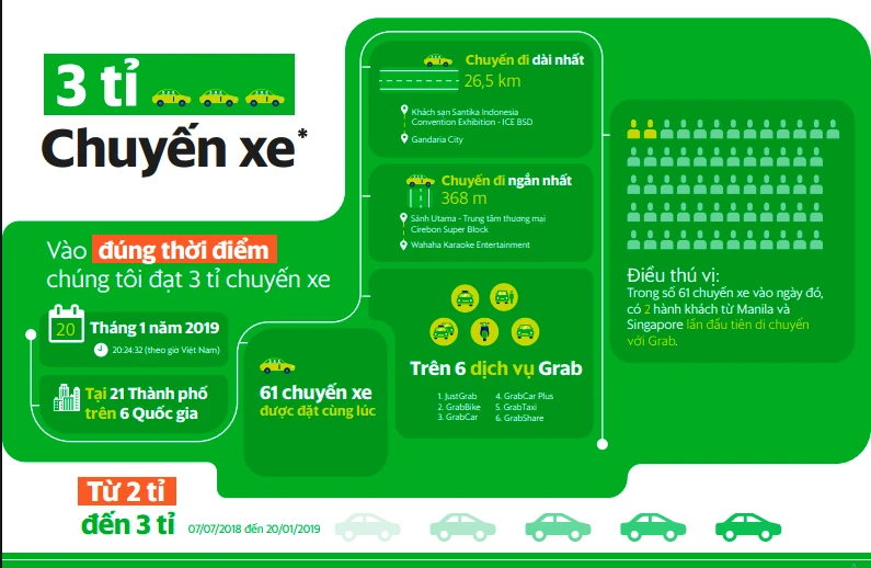 Tại thời điểm đạt cột mốc 3 tỉ chuyến xe, có 61 chuyến xe Grab diễn ra vào cùng thời điểm tại 21 thành phố trên 6 quốc gia. Chuyến đi ngắn nhất trong số này chỉ 368m tại Cirebon (Indonesia) và chuyến xe dài nhất là 26,5 km diễn ra tại Jakarta (Indonesia).