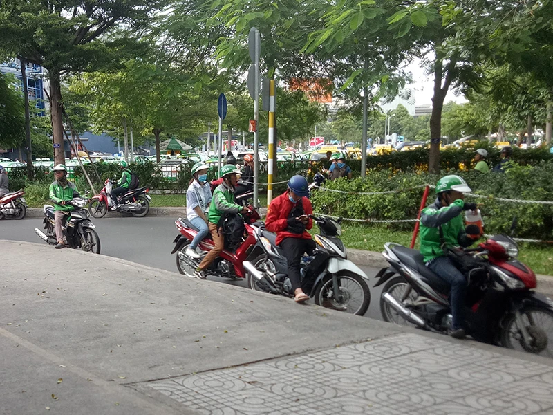 Theo quan sát của PV, các tài xế xe ôm công nghệ này thường tập trung trước bãi giữ xe hai bánh ở sân bay để tiện hoạt động. Tại đây luôn có một người đứng đầu, cũng mặc đồng phục của Grab, trên tay luôn cầm điện thoại đi tới lui để điều hành xe đưa đón khách.