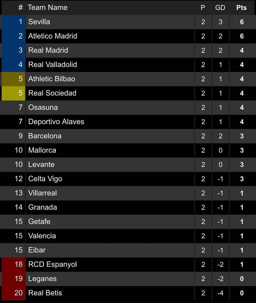 Bảng xếp hạng La Liga: