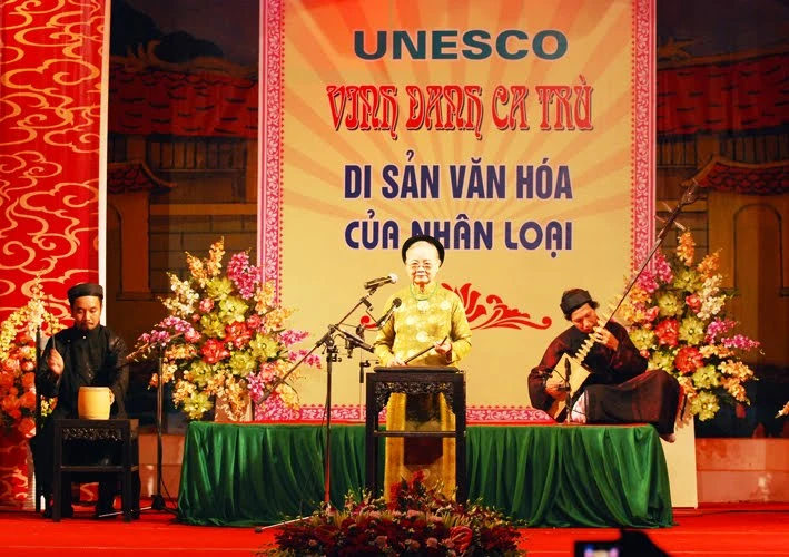 | Hát ca trùlà một bộ môn nghệ thuật truyền thống ở phía Bắc Việt Namkết hợp hát cùng một số nhạc cụ dân tộc. Ca trù thịnh hành từ thế kỷ 15, từng là một loại ca trong cung đình và được giới quý tộc và trí thức yêu thích. Ca trù là một sự phối hợp nhuần nhuyễn và đỉnh cao giữa thi ca và âm nhạc. Ngày 1 tháng 10 năm 2009, tại kỳ họp lần thứ 4 của Ủy ban liên chính phủ Công ước UNESCO Bảo vệ di sản văn hóa phi vật thể (từ ngày 28 tháng 9 tới ngày 2 tháng 10 năm 2009), ca trù đã được công nhận là di sản phi vật thể cần bảo vệ khẩn cấp. Đây là một Danh hiệu UNESCO ở Việt Nam có vùng ảnh hưởng lớn, với phạm vi tới 16 tỉnh, thành phố ở nửa phía Bắc Việt Nam. Hồ sơ đề cử Ca trù là di sản văn hóa thế giới với không gian văn hóa Ca trù trải dài khắp 16 tỉnh phía Bắc gồm: Phú Thọ, Vĩnh Phúc, Hà Nội, Bắc Giang, Bắc Ninh, Hải Phòng, Hải Dương, Hưng Yên, Hà Nam, Nam Định, Thái Bình, Ninh Bình, Thanh Hóa Nghệ An, Hà Tĩnh và Quảng Bình(Theo Bách khoa toàn thư mở Wikipedia). |