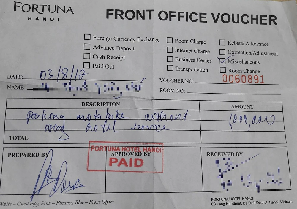 Theo đó, Fortuna là khách sạn quốc tế, các biên lai, giấy tờ đều ghi bằng tiếng Anh. Có thể anh C. hiểu lầm khoản tiền 1 triệu đồng là thu phí trông giữ xe, nhưng thực tế không phải vậy, số tiền này là để nộp phạt.
