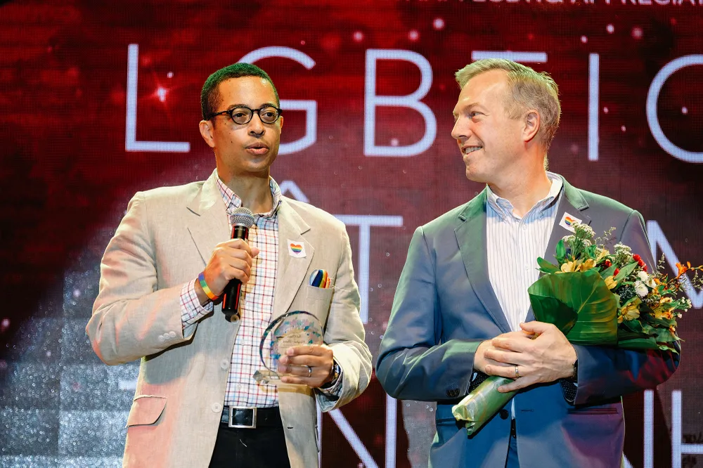 Trong phần trao giải thưởng Người đồng hành của năm, cựu đại sứ Mỹ Ted Osius và bạn đời, ông Clayton Bond đã trao tặng cho cô Cao Kim Châu - một phụ huynh có con trai là người đồng tính nam.
