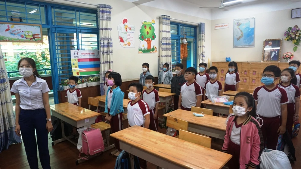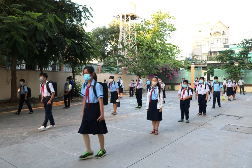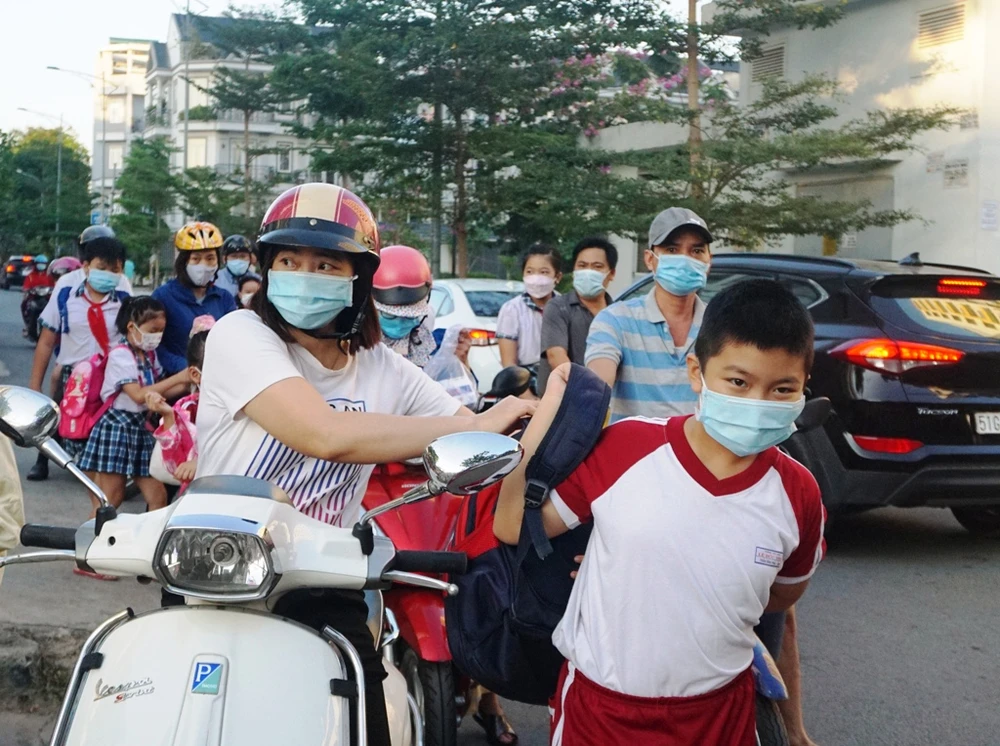 Sáng 1-3, hơn 1,7 triệu học sinh TP.HCM đã đi học trở lại sau một thời gian ngừng đến trường. Từ 6 giờ sáng, phụ huynh Trường Tiểu học Lê Đức Thọ đã đưa con tới trường và tuân thủ nghiêm các biện pháp phòng dịch COVID-19.