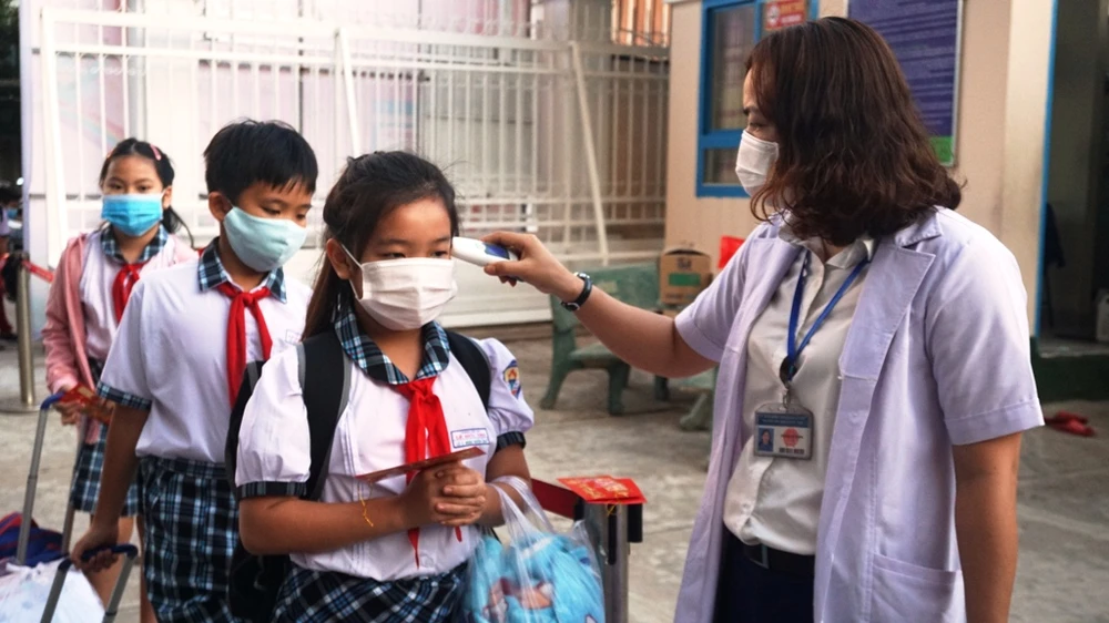 phân thành 4 làn để đón học sinh và xịt nước rửa tay, do thân nhiệt. Trước khi đến lớp, học sinh đã khai báo y tế điện tử để được theo dõi sức khỏe, lịch trình di chuyển trong suốt thời gian nghỉ Tết.