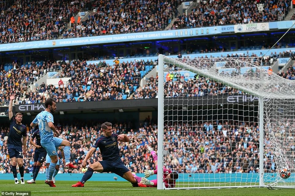 Bernardo Silva đá bồi cận thành giúp Man. City khép lại hiệp một với lợi thế dẫn trước 1-0. Ảnh: Getty Images.