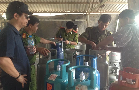 Các DN lo ngại tình trạng chiếm dụng vỏ bình, hoán đổi sang chiết khiến gas lậu, gas giả nhiều hơn. Trong ảnh: Cơ quan chức năng tỉnh Long An đang niêm phong, tạm giữ những bình gas sang chiết trái phép. Ảnh: TÚ UYÊN