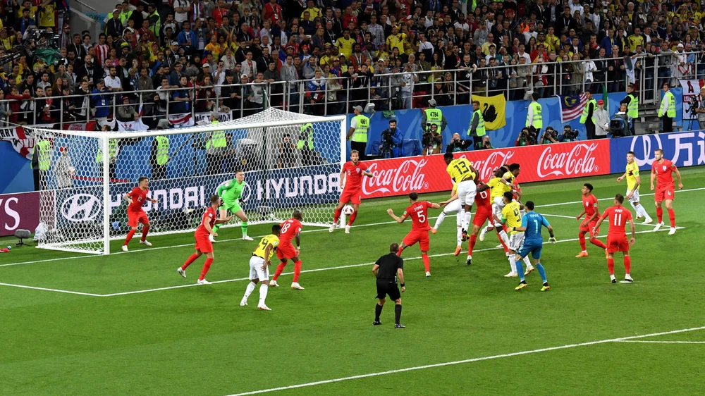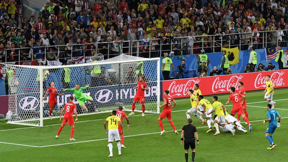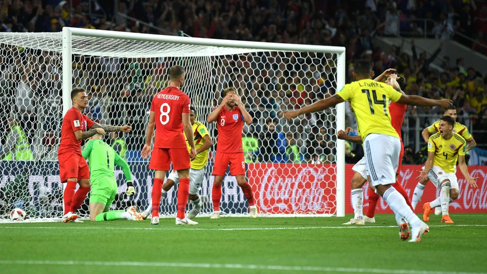 Những tưởng chiến thắng đã nằm chắc trong tay người Anh thì phút 90+3 họ bị thủng lưới từ pha tấn công gần như là cuối cùng của đại diện Nam Mỹ. Từ quả đá phạt góc, thủ thành Ospina cũng dâng lên tham gia tấn công, Juan Cuadrado treo bóng vào và không ai khác lại là trung vệ cao kều Mina giải cứu Colombia khi anh bật cao đánh đầu tung lưới Pickford san bằng tỉ số 1-1 cho Colombia buộc hai đội thi đấu thêm 30 phút hai hiệp phụ.