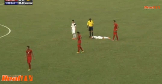 Phút 13, cầu thủ U19 VN phải nằm sân sau pha phạm lỗi thô bạo của cầu thủ đối phương.