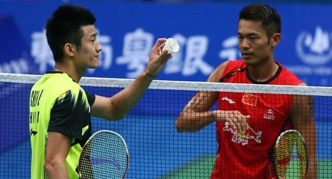 Lin Dan (áo đỏ) và đương kim vô địch Olympic Chen Long (áo xanh).