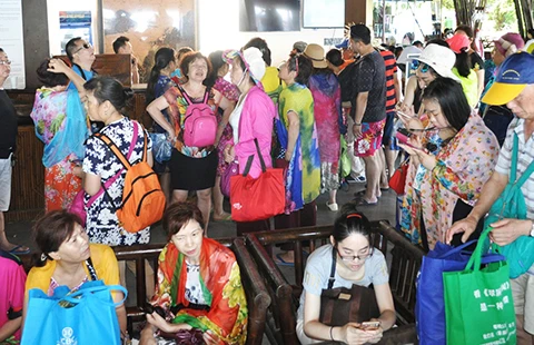Nhiều cơ sở phục vụ khách TQ đua nhau hạ giá bán hút khách. Trong ảnh: Khách TQ chen nhau tại một cơ sở dịch vụ du lịch ở Nha Trang. Ảnh: TẤN LỘC