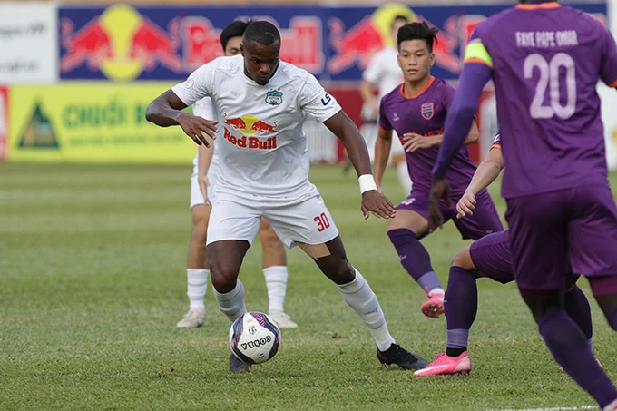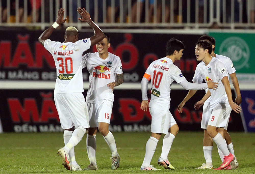 Văn Toàn (9) và Brandao (30) hai lần đưa HS Gia Lai vượt lên dẫn nhưng bị đối thủ san bằng. Ảnh: ANH ĐỒNG