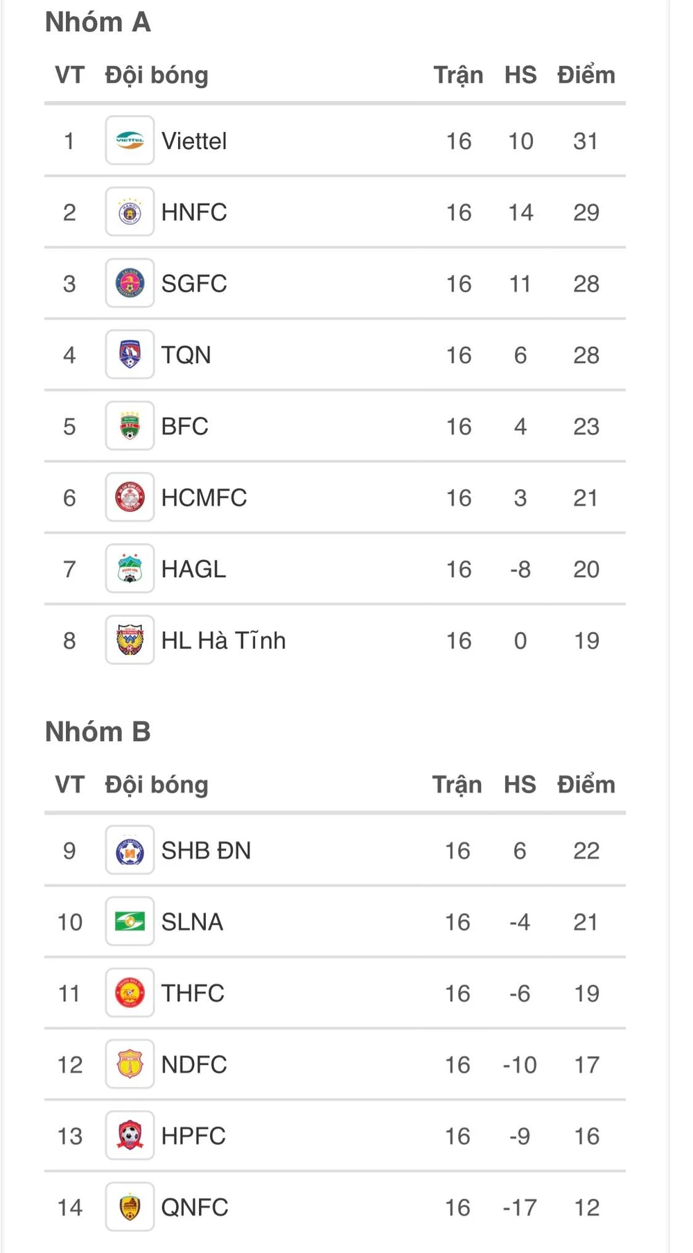 Bảng xếp hạng của hai nhóm đội sau 16 trận đấu.