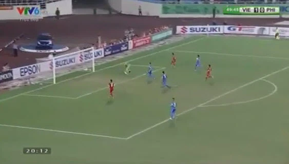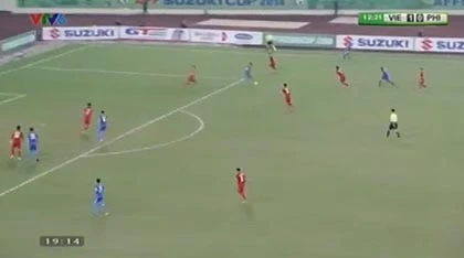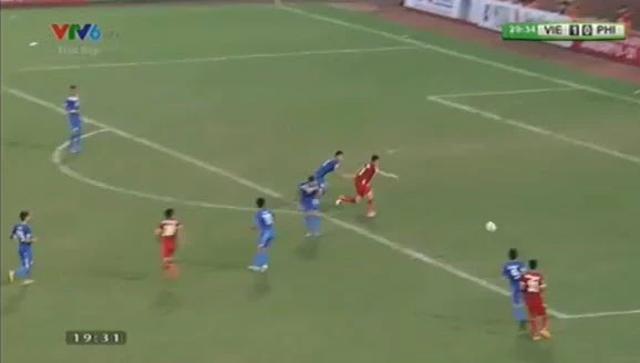 Phút 41, Công Vinh bức tốc vượt qua hậu vệ Philippines nhưng cú căng ngang cuối cùng của anh quá hiền, thủ môn Philippines đã kịp đổ người ôm gọn bóng.