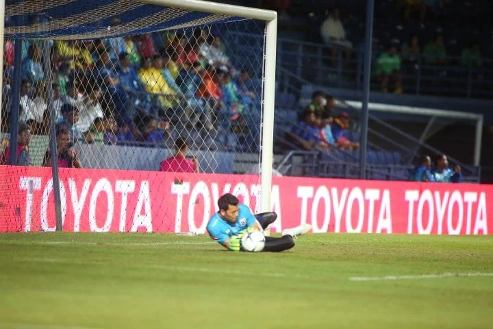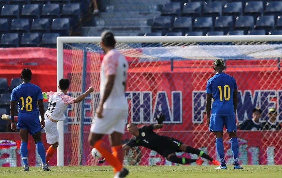 Phút 25, Quang Hải thực hiện cú sút thẳng từ quả đá phạt trực tiếp ở cự ly rất xa, bóng đi căng nhưng không đủ khó để hạ gục Kawin.