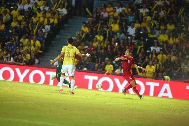 Phút 32, Trọng Hoàng phá bóng không tốt để Thitiphan có cơ hội tung chân dứt điểm rất nguy hiểm nhưng bóng đi chệch cột.