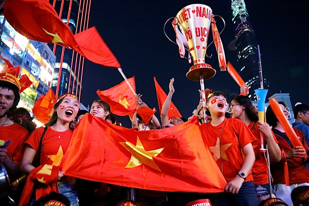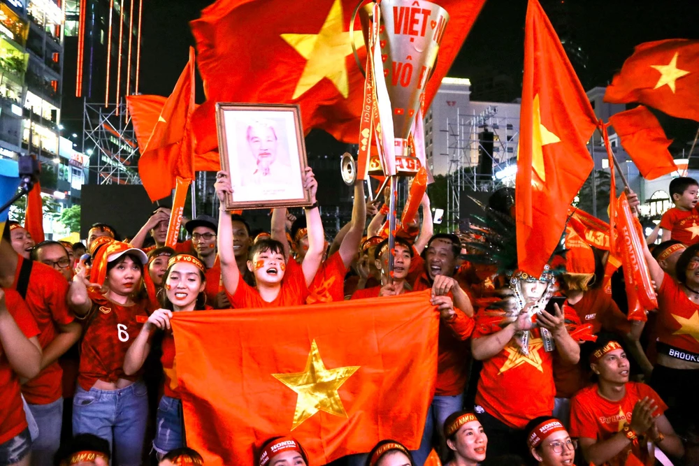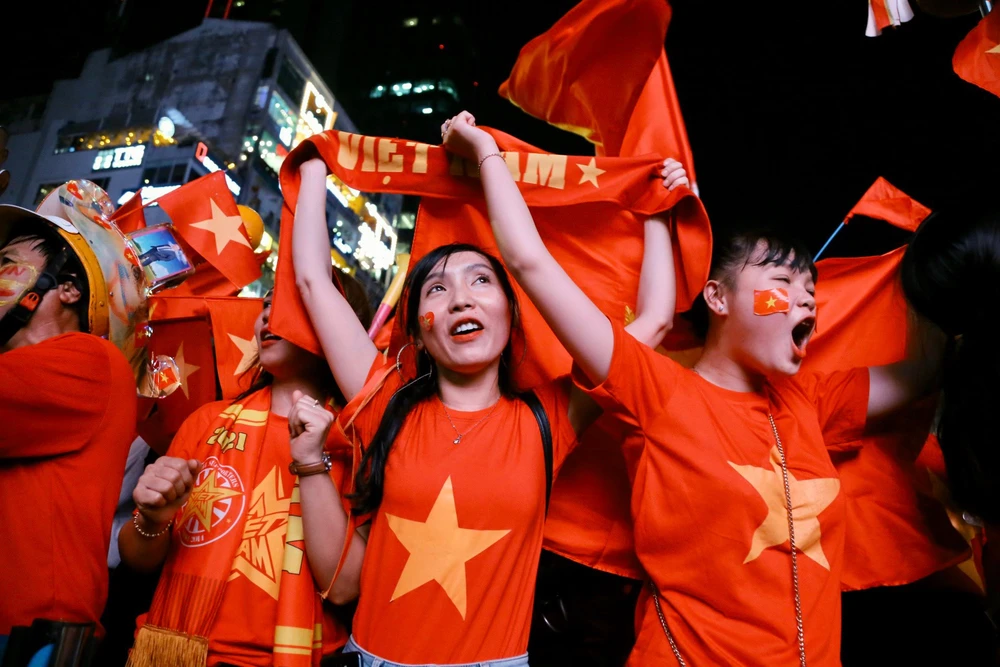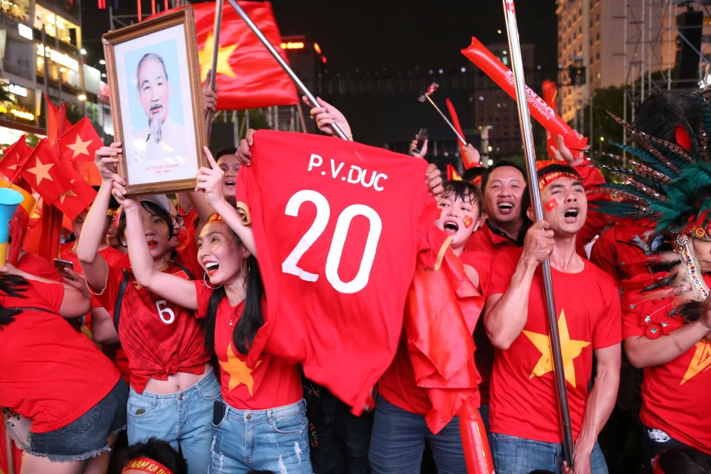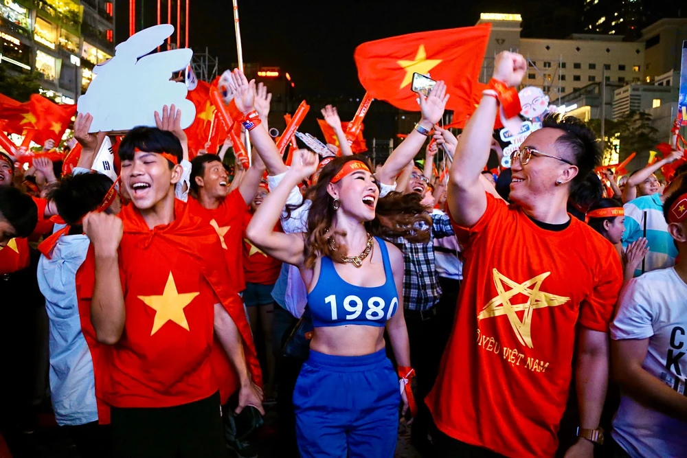 Các CĐV ăn mừng bàn thắng ở phố đi bộ Nguyễn Huệ. Ảnh: HOÀNG GIANG