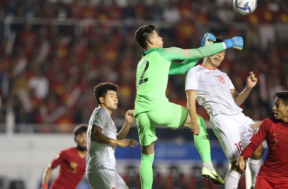 Phút 54, Hùng Dũng treo bóng vào rất nguy hiểm, thủ môn Nadeo lao ra đẩy bóng ra ngoài ngay trên đầu cầu thủ Việt Nam.