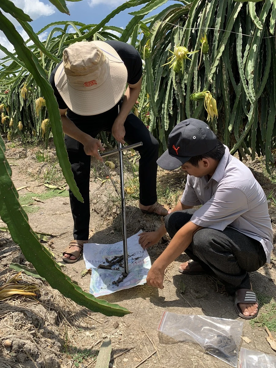 Đội ngũ kỹ sư nông nghiệp lấy mẫu đất tại vườn cây ăn trái của nông dân liên kết tỉnh Long An