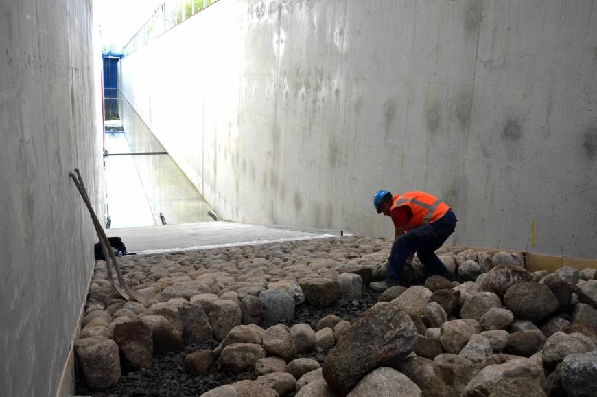 Một công nhân lót đá bên trong máy tạo sóng lớn nhất thế giới ở Delft, Hà Lan