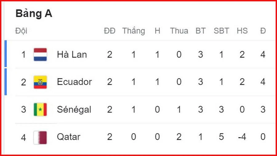 Hà Lan đứng đầu bảng sau lượt trận thứ hai hòa thất vọng 1-1 trước Ecuador khiến họ xếp trên đối thủ này về hiệu số bàn thắng bại và hơn đội xếp thứ ba là Senegal 1 điểm.