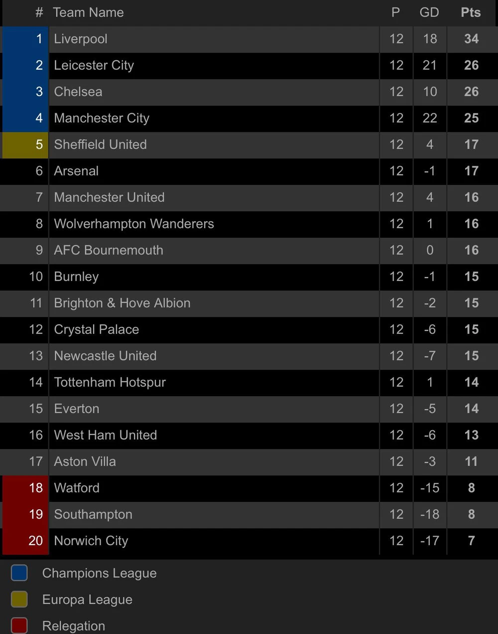 Giành chiến thắng với tỷ số 3-1 trên sân nhà Anfield, Liverpool một mình độc chiếm ngôi đầu với 34 điểm sau 12 trận bất bại, hơn đội xếp thứ hai là Leicester City 8 điểm. Trận thua này khiến Man. City hụt hơi trong hành trình bảo vệ ngôi vương. Bên cạnh đó, “Man xanh” còn bị Leicester City và Chelsea vượt mặt và rơi xuống vị trí thứ tư với 25 điểm.
