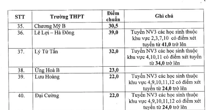 Tính cho tới thời điểm này, trường có điểm chuẩn cao nhất vẫn là Trường THPT Chu Văn An. Các trường có điểm chuẩn thấp nhất là trường THPT Đại Cường, Lưu Hoàng, Ứng Hòa B với ngưỡng điểm 22,0-23,0 điểm.