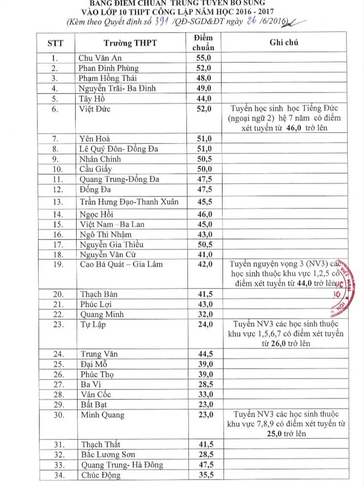 Bảng điểm bổ sung điểm chuẩn vào lớp 10 THPT công lập năm học 2016-2017 của Sở GD&ĐT TP Hà Nội.