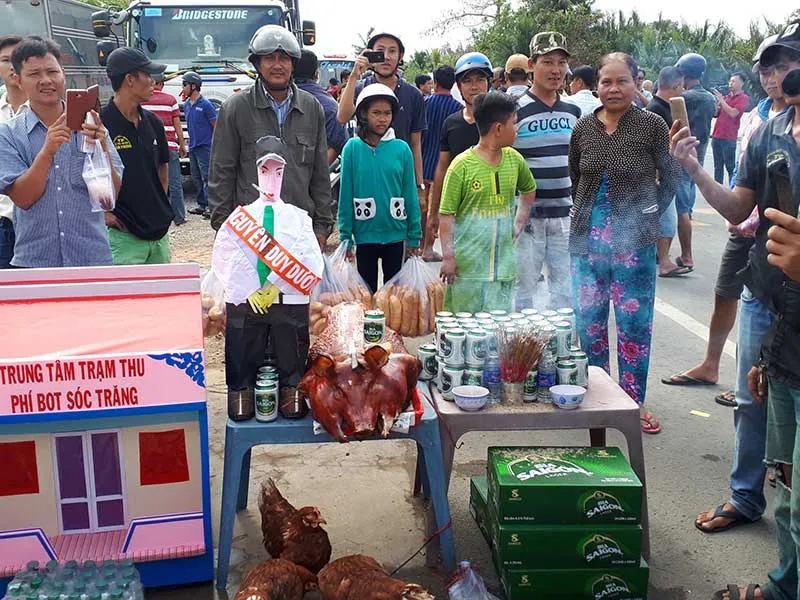 Các tài xế bày bàn cúng bên đường, cách trạm BOT Sóc Trăng khoảng 100 m vào sáng 11-1. Ảnh : TRẦN VŨ