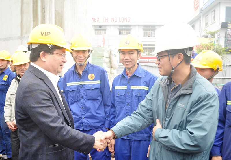 Phó Thủ tướng Trịnh Đình Dũng thăm hỏi công nhân đang làm việc tại công trường ga số 2, tuyến đường sắt Nhổn - ga Hà Nội.