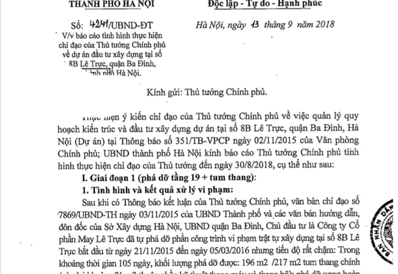 Báo cáo gửi Thủ tướng Chính phủ của UBND TP Hà Nội về xử lý công trình sai phạm 8B Lê Trực.