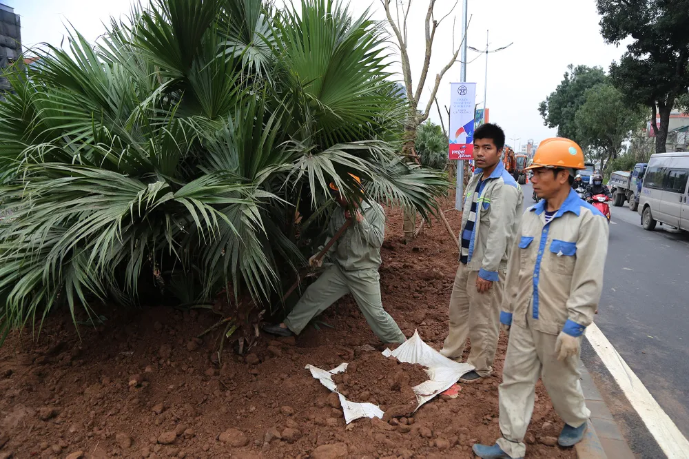 Trên đường Láng, công nhân gấp rút hoàn thiện những phần việc cuối cùng để chỉnh trang đường phố trước thềm hội nghị.