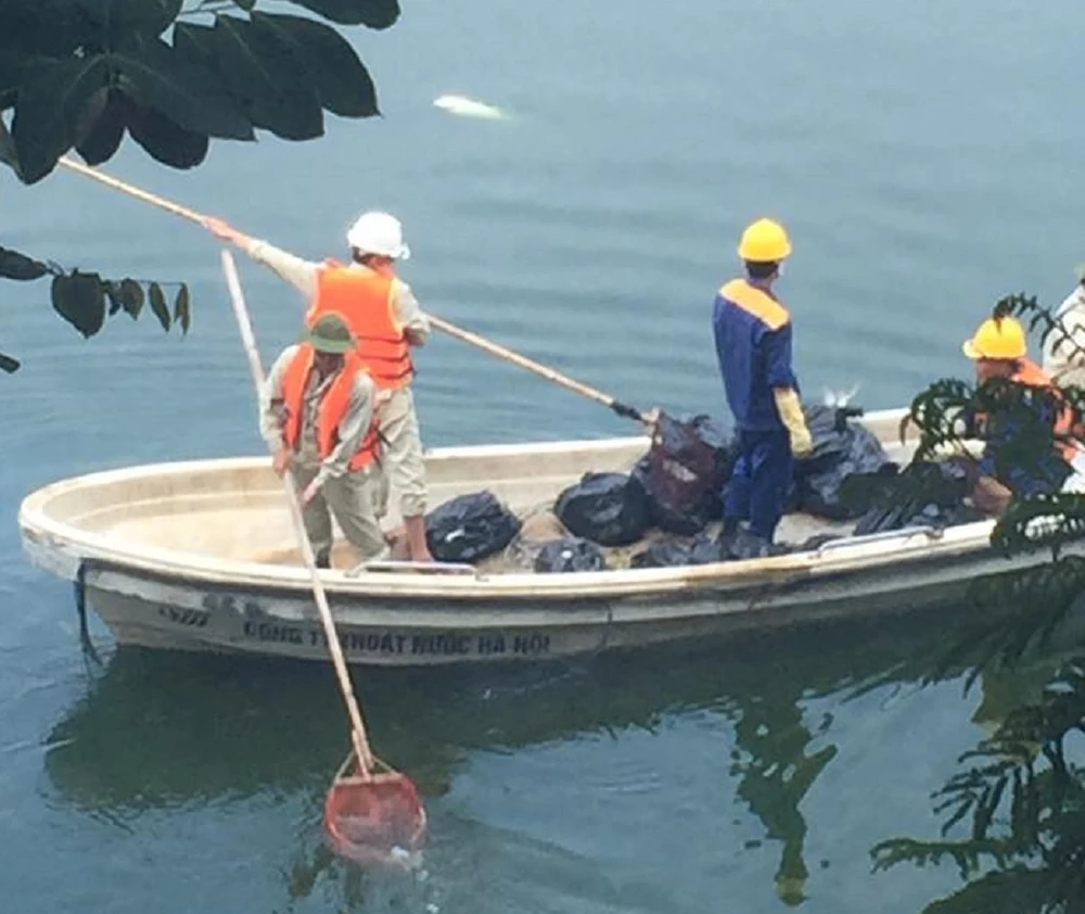 Nhận được thông tin, các công nhân của Công ty thoát nước Hà Nội cùng 4 ca nô đã có mặt để vớt cá chết. Số cá bị chết chủ yếu là cá chép, cá trôi..., nặng từ 1 đến 3kg/con.