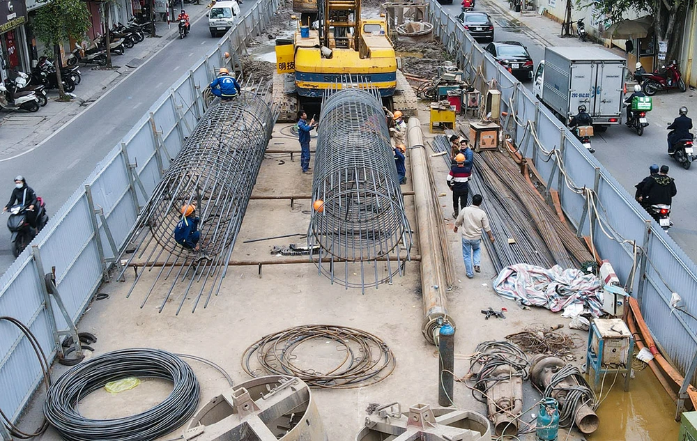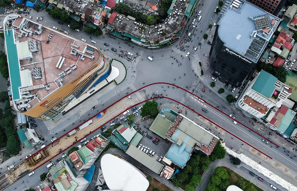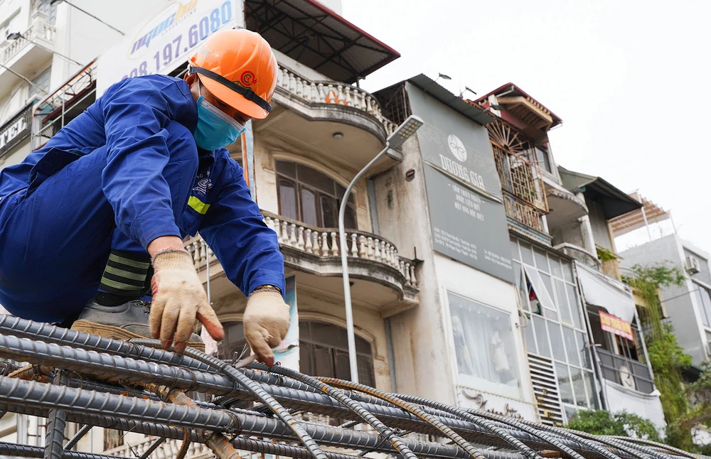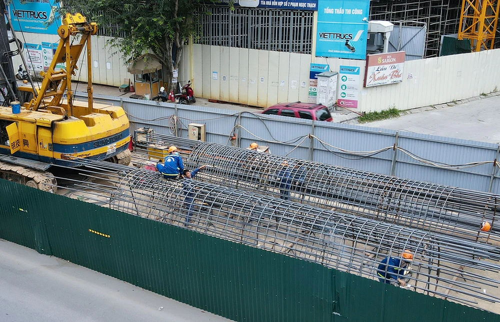 Ghi nhận tại nút giao Phạm Ngọc Thạch - Chùa Bộc - Tôn Thất Tùng (Đông Đa – Hà Nội), nhiều công nhân đang tiến hành thi công dự án cầu vượt chữ C.