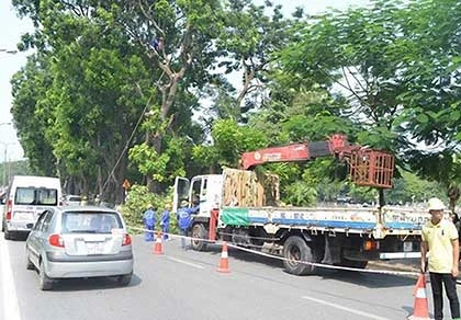 Các công nhân đang cắt tỉa, di dời cây xanh trên tuyến phố Kim Mã. Ảnh: TP