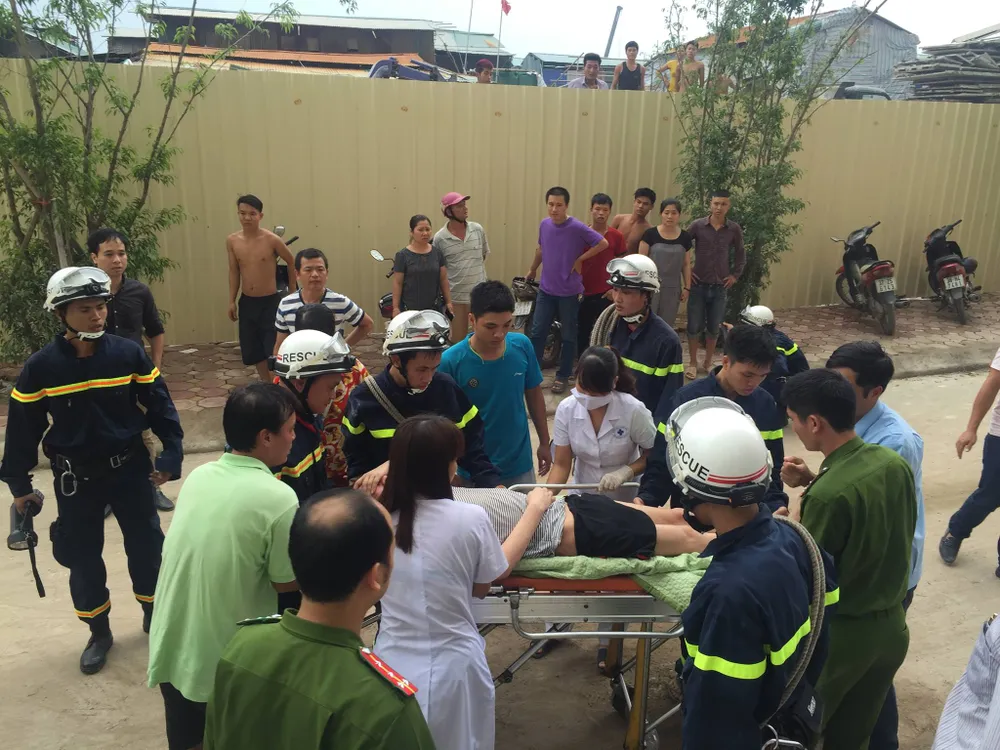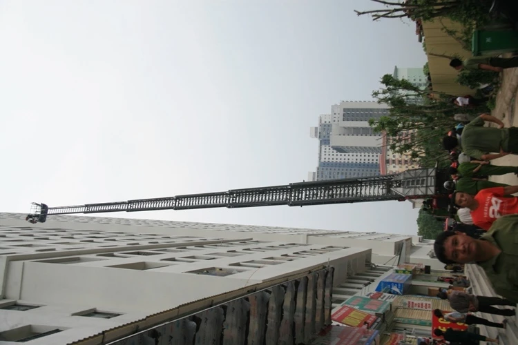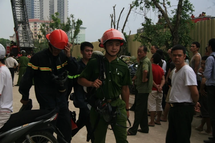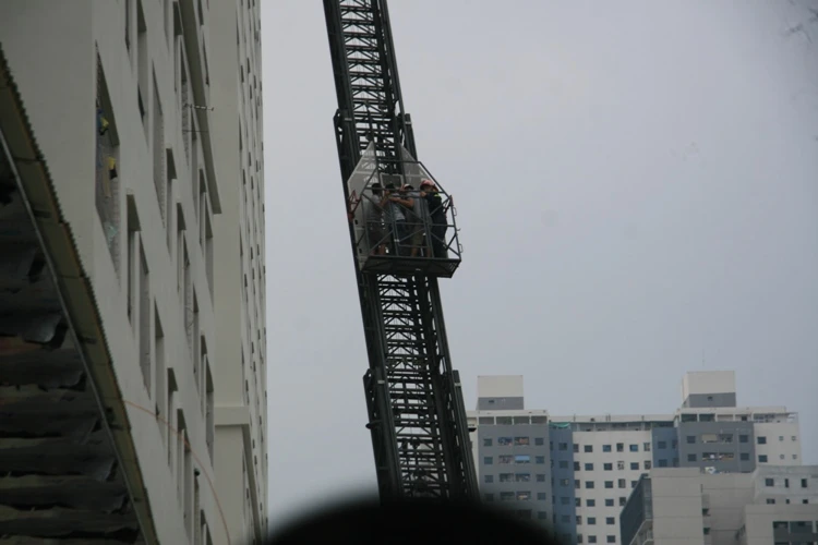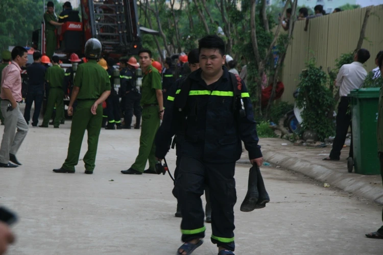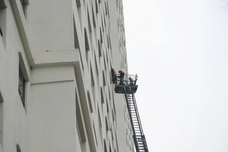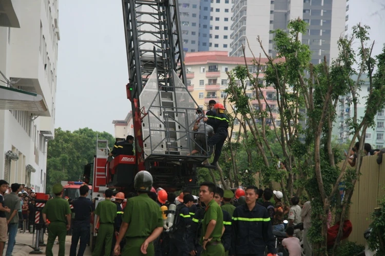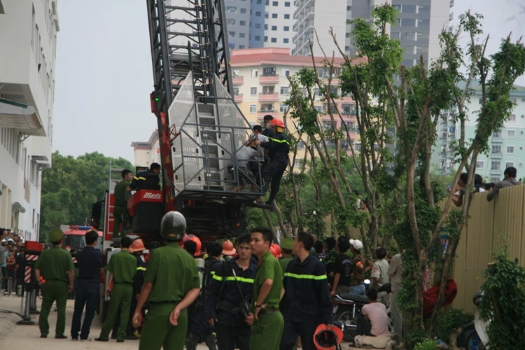 Theo ghi nhận tại hiện trường, từ tầng 5 của toàn nhà này khối bốc mù mịt. Lực lượng cứu hỏa đã phải dùng thang chuyên dụng để đưa người mắc kẹt trong tòa nhà xuống.
