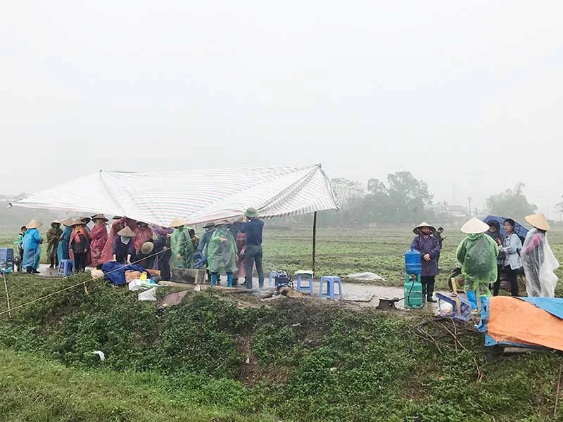 Đến trưa 14-1, người dân quanh bãi rác Nam Sơn vẫn căng lều bạt, đội mưa ngăn cản xe chở rác. Ảnh: TRỌNG PHÚ