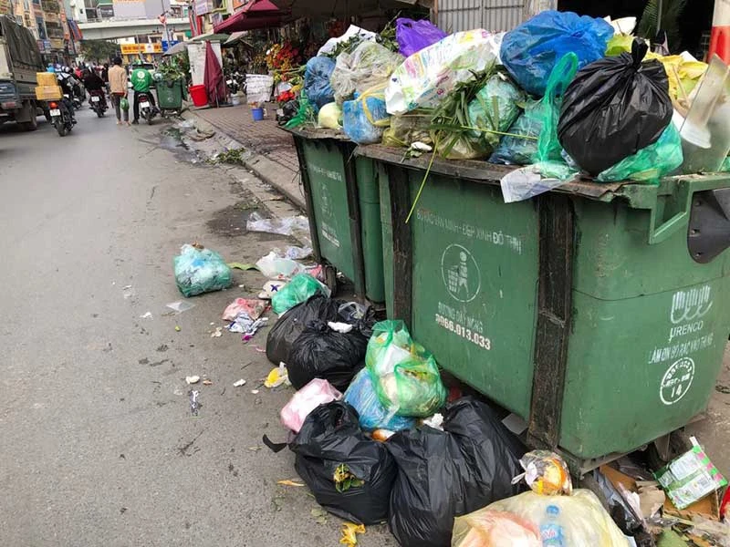 Rác ùn ứ tại nhiều đường phố nội thành Hà Nội do bãi rác Nam Sơn bị phong tỏa. Ảnh: TRỌNG PHÚ
