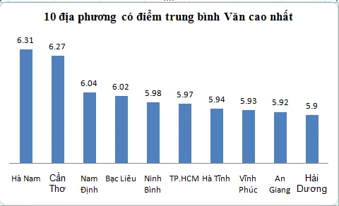 Top 10 địa phương có điểm trung bình ngữ Văn cao nhất vẫn là những cái tên quen thuộc như Hà Tĩnh, Nam Định, Hà Nam, Bạc Liêu. Năm nay, xuất hiện nhiều tỉnh thành mới có sự đột phá và giữ vị trí cao trong “bảng xếp hạng” như Cần Thơ ở vị trí thứ hai (6,27 điểm), TP.HCM xếp thứ 6 (5,97), Vĩnh Phúc đứng thứ 8 (5,93), An Giang xếp thứ 9 (5,92).