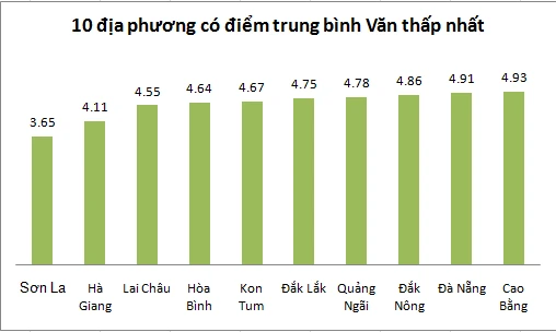 Sơn La là địa phương có điểm trung bình Ngữ văn là 3,65 điểm, thấp nhất cả nước. Một số địa phương vẫn tiếp tục ở top cuối gồm Hà Giang, Sơn La, Hòa Bình. Đà Nẵng cũng là địa phương nằm trong nhóm này với điểm trung bình môn Ngữ văn là 4,91.