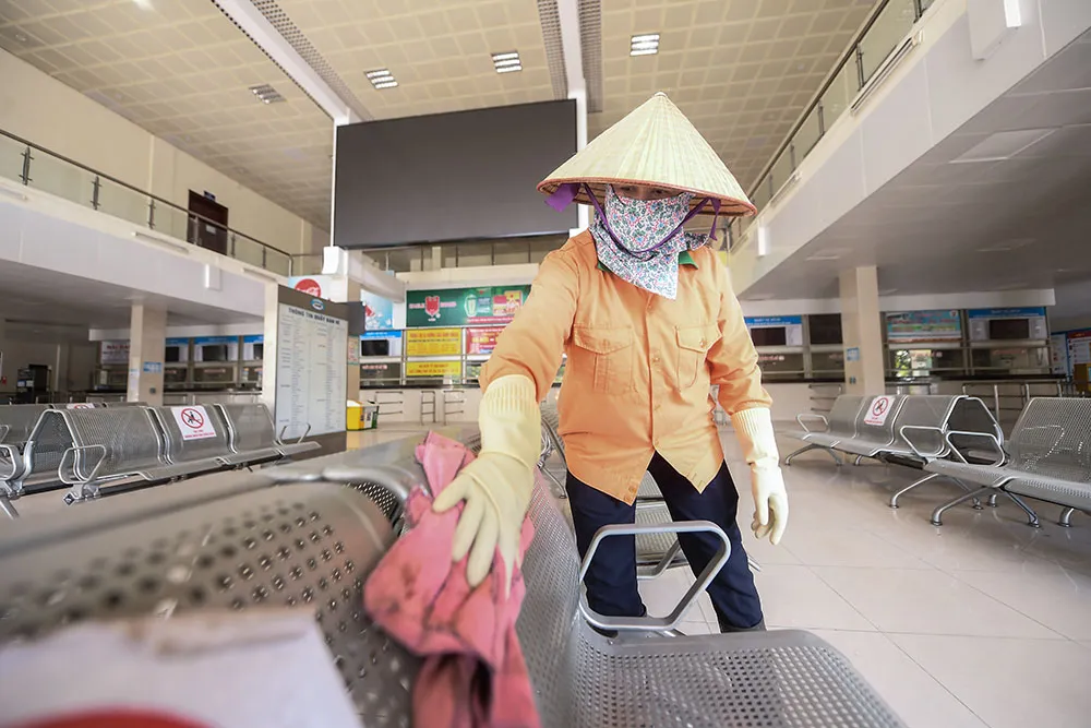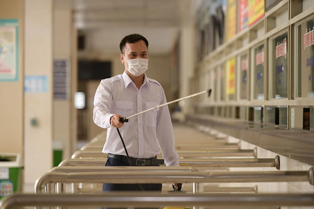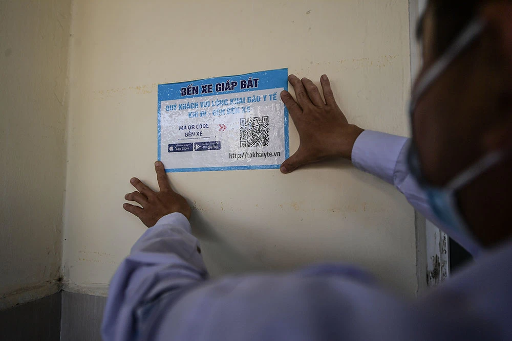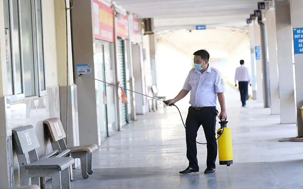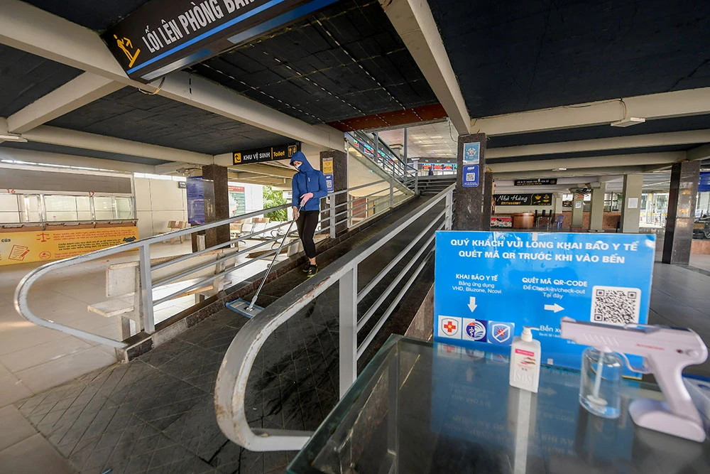 Tại bến xe Giáp Bát, nhân viên đi từng ngõ ngách để phun khử khuẩn, dọn vệ sinh, dán mã QR,... theo quy định chung khi mở cửa trở lại.