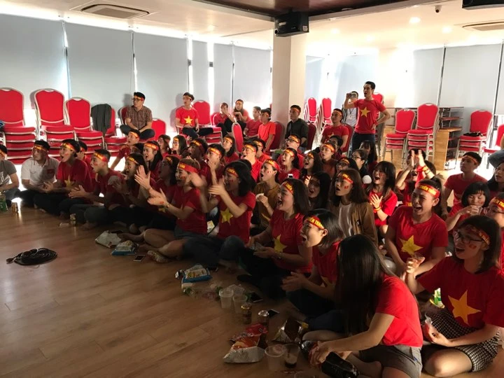Các nhân viên của Công ty sách MCBooks xem và cổ vũ cho đội bóng tại công ty.