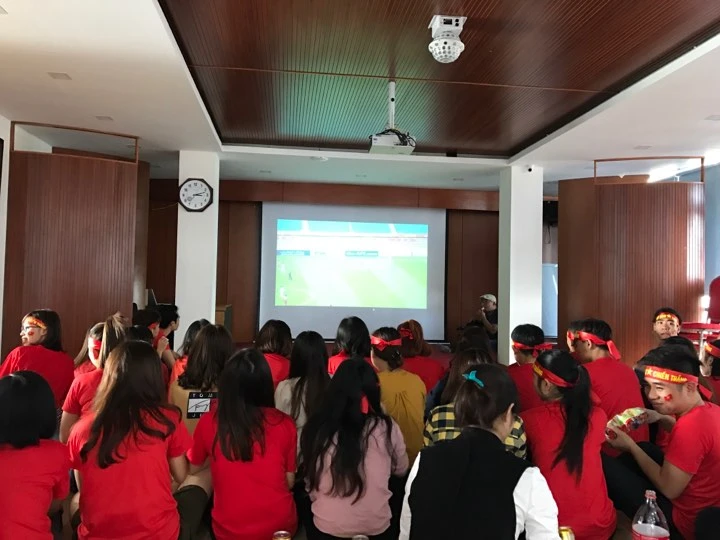 Nhiều công sở còn bố trí máy chiếu, phục vụ ăn uống cho nhân viên trong thời gian cổ vũ cho đội bóng U23 thi đấu.