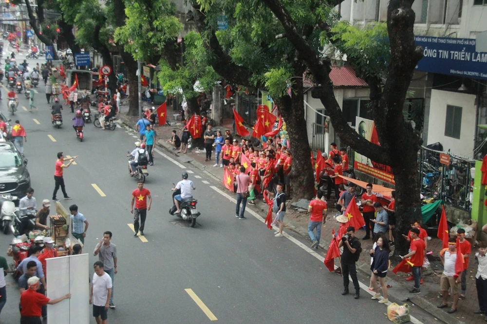 Họ mang theo cờ, băng rôn, một số thì mặc đồng phục, tất cả đều rực một màu đỏ, sẵn sàng "bùng lửa" cùng đội tuyển quê nhà.