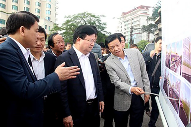 Phó Thủ tướng Trịnh Đình Dũng kiểm tra dự án cầu vượt qua nút giao thông đường Thanh Niên - cửa khẩu An Dương sáng 17-2.