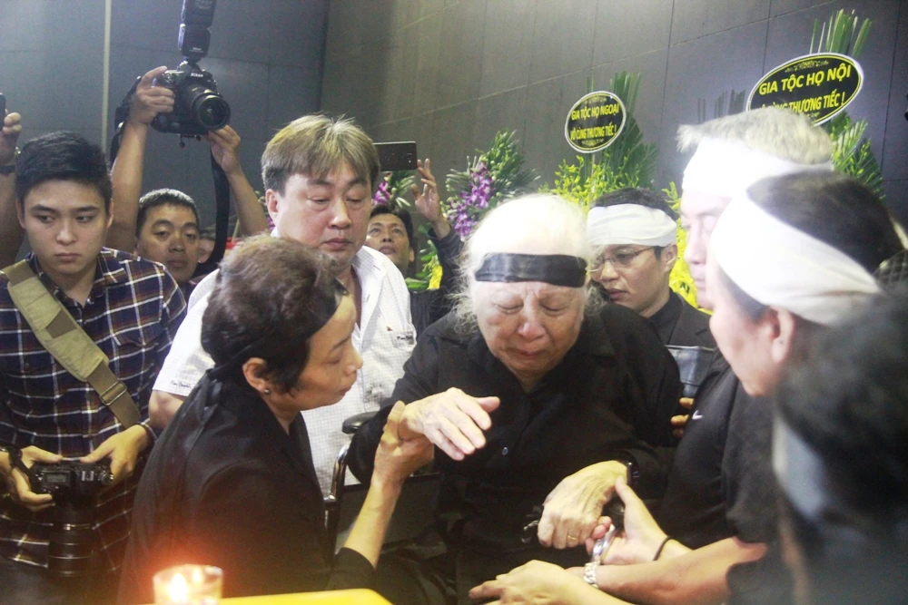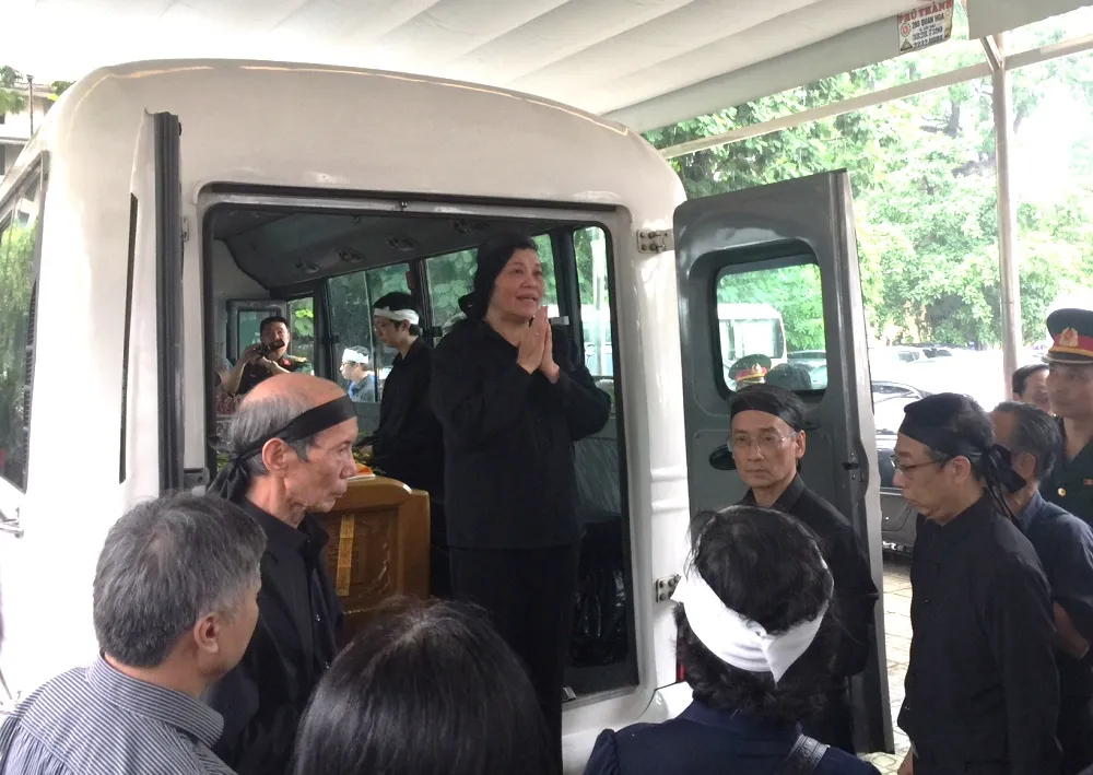 Bà Hoàng Thị Lan, vợ GS Phan Huy Lê, phải ngồi xe lăn nghẹn ngào tiễn đưa chồng.