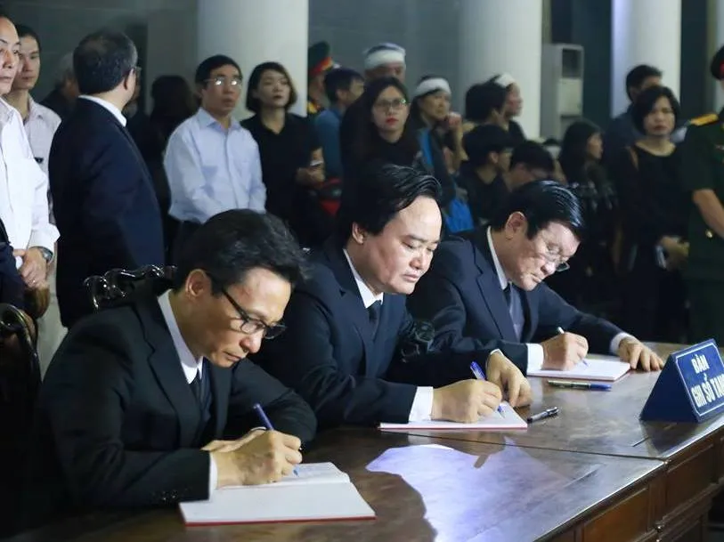 Nguyên Chủ tịch nước Trương Tấn Sang, Phó Thủ tướng Vũ Đức Đam và Bộ trưởng Bộ GD&ĐT Phùng Xuân Nhạ ghi sổ tang.