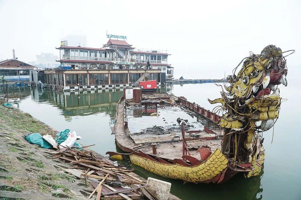 Tại khu vực Đầm Bảy, ngay mép nước Hồ Tây, (quận Tây Hồ - Hà Nội), sáng 17-11, công nhân đã tháo dỡ gần xong một chiếc thuyền, chỉ còn lưu lại phần đầu rồng đã cũ nát.