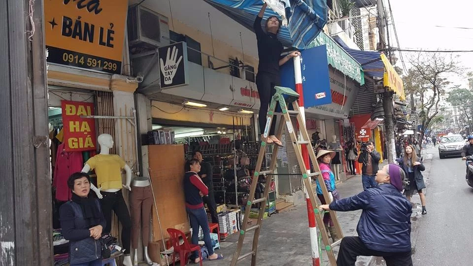 Tại phố Hàng Đào thuộc quận Hoàn Kiếm - Hà Nội người dân tự tay tháo những tấm bạt để trả lại sự thông thoáng cho vỉa hè.