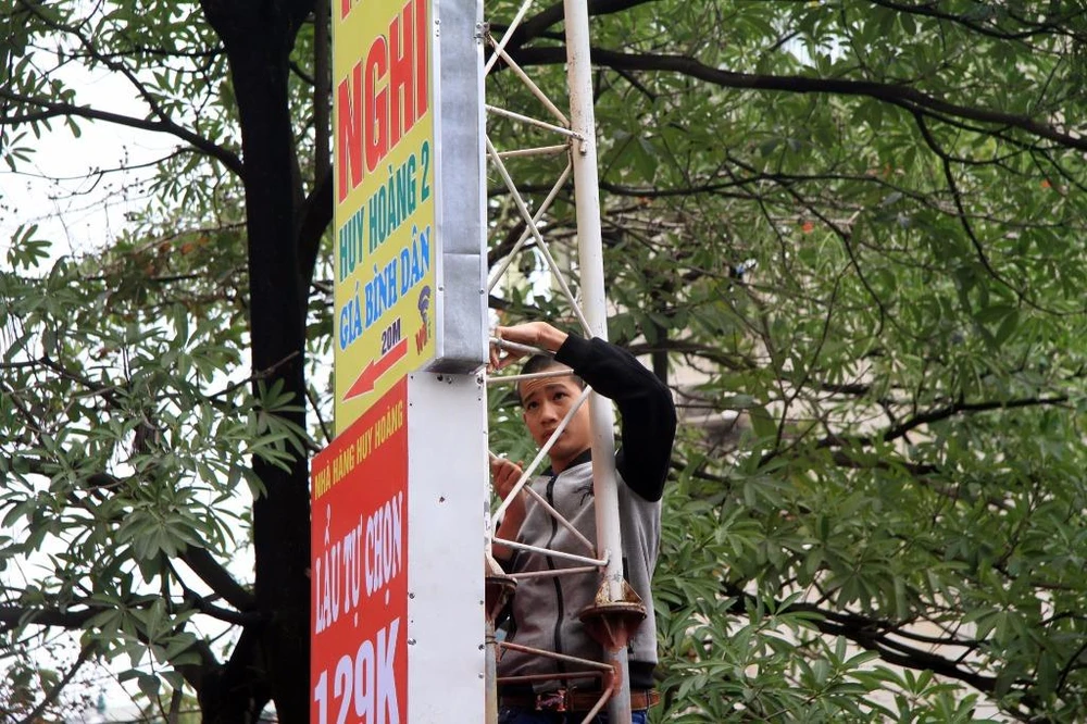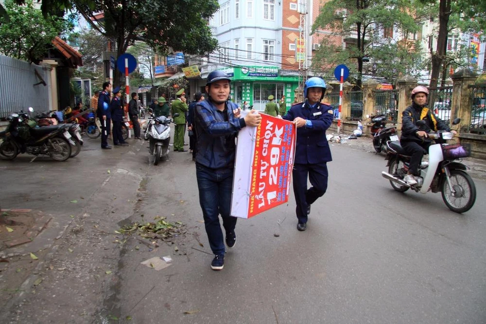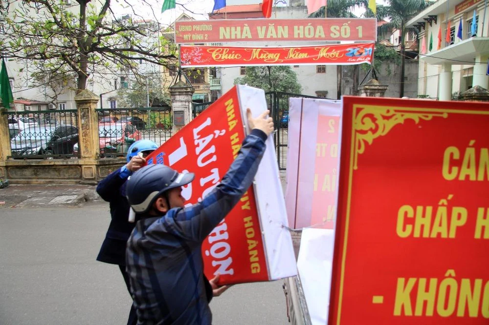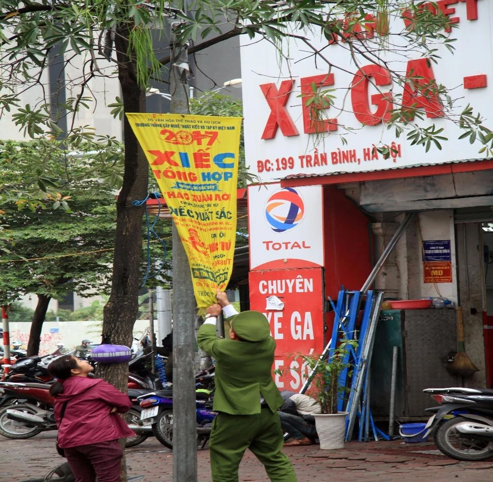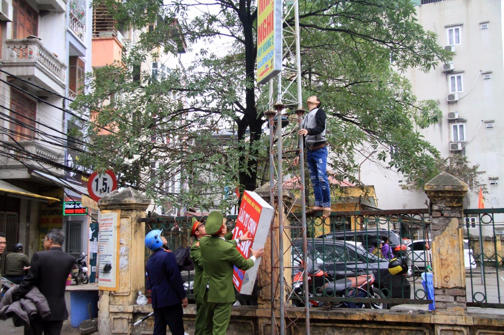 Lực lượng chức năng nhắc nhở người dân. Đồng thời tự tay tháo dỡ những biển quảng cáo, băng rôn sai quy định, mấy mỹ quan đô thị.