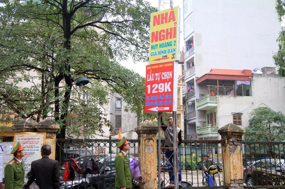 Sau khi nhắc nhở nhưng không sự hợp tác. Những chiếc biển quảng cáo của một nhà hàng, nhà nghỉ được lực lượng chức năng tháo dỡ...